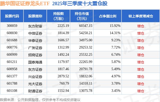 从基金规模来看,鹏华国证证券龙头ETF基金2025年三季度公布的基金规模为37.9亿元,较上一期规模20.48亿元变化了17.43亿元,环比变化了85.09%。该基金最新一期资产配置为:股票占净值比97.99%,无债券类资产,现金占净值比2.65%。从基金持仓来看,该基金当季前十大股票仓位达77.48%,第一大重仓股为东方财富(300059),持仓占比为15.92%。