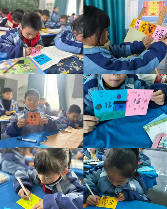 2025年12月30日上午,系列活动首篇章“童绘新年创意绘画手工创作”正式启动,各年级围绕特色主题同步开展创作,现场创意十足、热闹非凡。一年级学生化身“民俗小画家”,紧扣“虎鸡呈祥”主题,通过彩泥捏制萌趣瑞兽、画笔勾勒灵动造型等形式,让传统吉祥符号在童趣表达中焕发新生;二年级以班级为单位打造“百福墙”,孩子们精心创作的福卡错落排布,不同字体、多样造型的“福”字与福娃图案相映成趣,汇聚成满墙真挚的新春祝福;三年级“彩虹艺术墙”创意凸显,全年级7个班级分别对应赤、橙、黄、绿、青、蓝、紫七色,学生通过绘画、拼贴等手法,将新年元素与自然景物融入作品,七色作品拼接成一幅绚烂夺目的彩虹画卷;四年级聚焦“吉鱼贺岁”主题,小创作者们先在素描纸上勾勒卡通鱼、锦鲤等造型,再经裁剪、颜料装饰,灵动的鱼儿搭配水草、浪花元素,跃然纸上尽显生机;五年级以“纸间年味”为核心,孩子们用画笔生动描绘贴春联、吃年夜饭、逛庙会等新年场景,每一幅作品都承载着鲜活的年俗故事;六年级则挑战“纸扇绘龙·盘面生花”创意拼贴,在集体创作的KT板作品上,小白盘绘有花卉、祥云等图案,剪纸与拼贴工艺交织出立体新春盛景,尽显学生巧思。